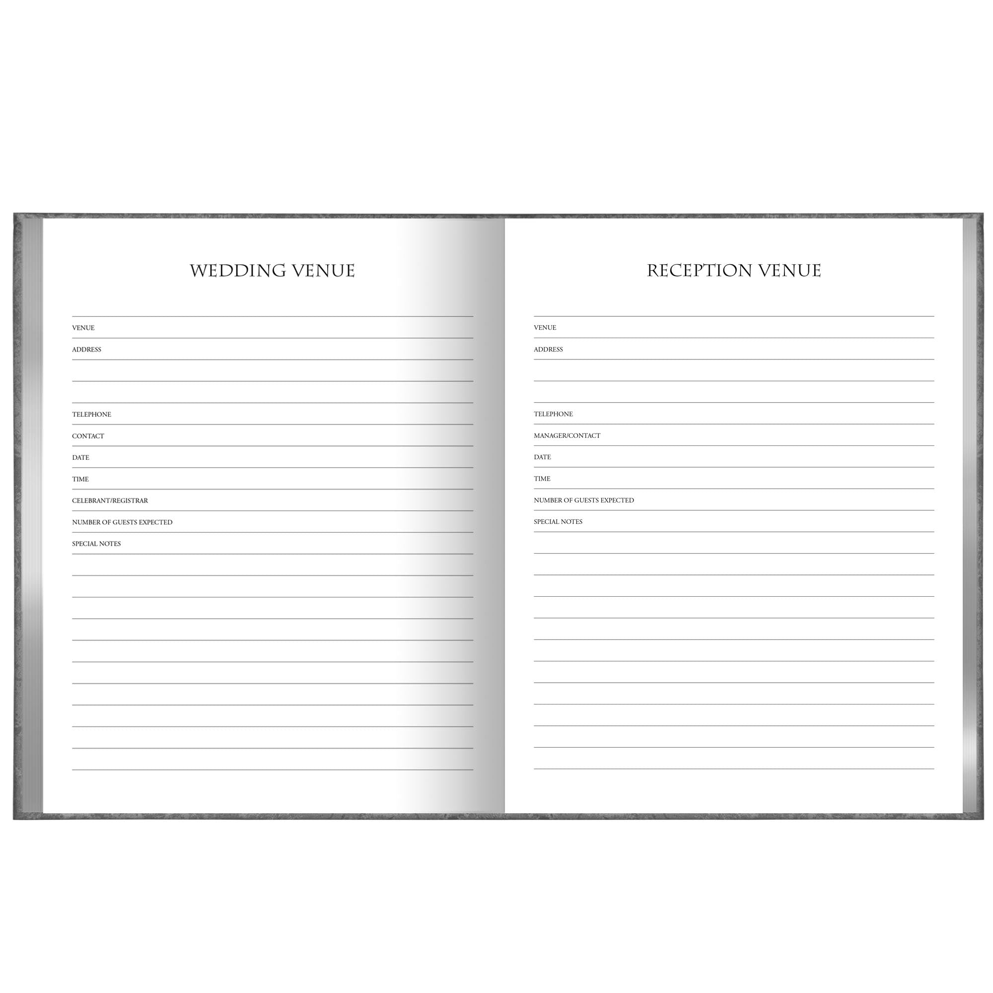 This book will help every happy couple enjoy planning their wedding day. It will become an interesting record of the careful preparation required to make the biggest day of their lives run smoothly and joyfully. Bound in our special Calabria material with white inner pages, it is finished with silver edging and foil blocking to the silver front cover.